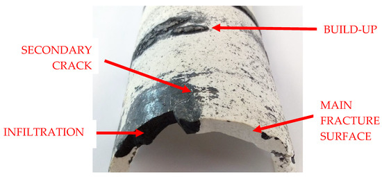 Regarding macroscopic inspection of the fracture surfaces of BR1 and BR2 (Figure 6), both samples looked very similar, indicating that the mechanical damage progress was analogous. In both cases, fractures showed several fatigue crack nucleation sites. The fatigue crack growing pattern left lighter color growing marks, which are interpreted as crack stops during bank-holidays and preventive maintenance furnace stand-by periods. The final ductile collapse of the rollers is displaced from the geometrical section of the roll because of the different loads that the rollers must bear depending on their angular position.