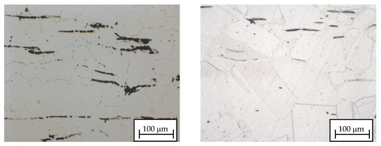 The metallographic analyses of the materials were performed by means of light microscopy (Leica Microsystems, Wetzlar, Germany). The inspections showed that the fracture area was submitted to high temperatures, in excess of 550 °C, as extensive sigma phase evolution and intergranular carbide precipitation were observed (Figure 5 left). The material did not show this microstructure in origin, as evidenced by the inspection of the cold journal zone fitting the motor (Figure 5, right).