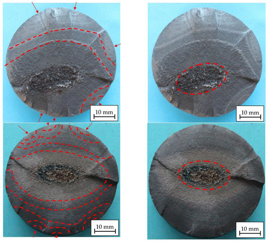Fracture surface of broken roll 1 (BR1) (top) and BR2 (bottom). Left. Several fatigue nucleation sites marked by arrows and crack stop lines marked with discontinuous lines. Right. Final ductile collapse surface of the roll.