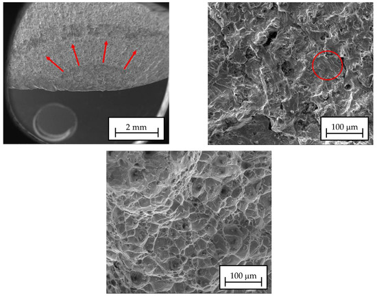 Scanning electron microscopy (SEM) micrographs of the three main fractographic features observed in BR1 and BR2. Top left. Fatigue nucleation site with the crack growth direction marked by arrows. Top right. Fatigue lines on the oxidized surface of the fatigue cracked area. Bottom. Ductile dimples in the final collapse zone.