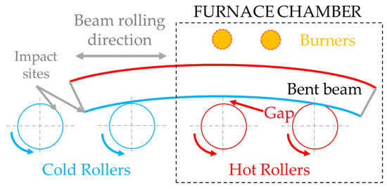Scheme of the effect of temperature differences between the top and the bottom of the beam. The rollers marked as “hot rollers” correspond to the fractured ones.