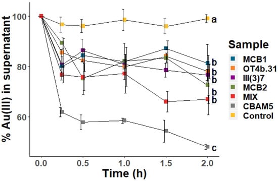 Gold (60 ppm) biosorption assay with free cells of L. sphaericus strains and a mixture (MIX) of some of them (CBAM5, MCB2 and III(3)7) with an OD605 = 0.9–1.2, pH = 5–6, for 2 h. Points at 2 h denoted by a different letter differ significantly at P < 0.05 according to a one-way ANOVA and a Tukey analysis.