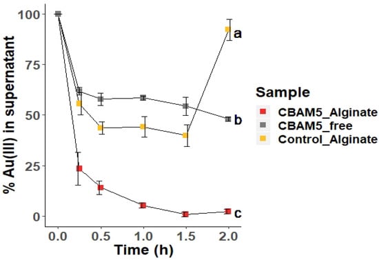 Gold (60 ppm) biosorption assays with free (CBAM5_free) and encapsulated (CBAM5_Alginate) cells of L. sphaericus CBAM5 with pH = 5–6. Control_Alginate: assay with alginate spheres without bacteria. Points at 2 h denoted by a different letter differ significantly at P < 0.05 according to a one-way ANOVA and a Tukey analysis.