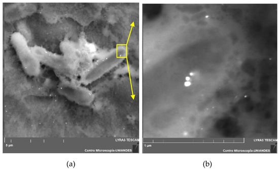 Moreover, a visual difference was identified between the control bioassay and the treatment with bacteria in alginate spheres, as shown in Figure 5b. The alginate matrix took on a red-purple color indicating a possible biosynthesis of gold nanoparticles, characterized by this color []. This result correlates with the SEM micrograph of the alginate spheres with bacteria taken after the first cycle. Figure 3b shows a close-up of a bacterial cell with gold particles of nanometric size, ranging from 200 to 600 nm.