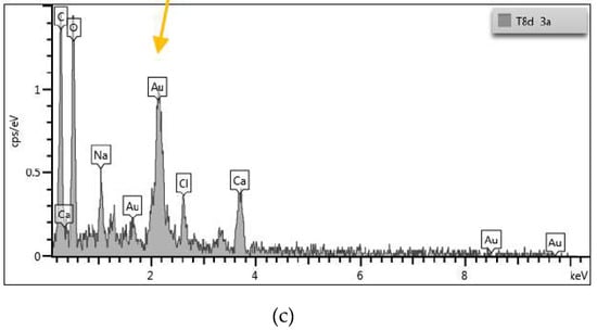 The analysis with SEM showed the presence of L. sphaericus CBAM5 within the alginate matrix (Figure 3a) and bacilli morphology was identified. The detection of backscattered electrons (Figure 3b) allowed the identification of areas with different compositions. Using an EDS analysis of those areas (Figure 3c), the presence of gold aggregates and possible nanoparticles inside the matrix and on the surface of the cells was determined.