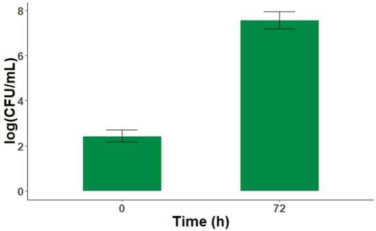 The protocol for quantification of the bacteria released was described before []. Minor modifications were made as follows: 1 g of alginate spheres with encapsulated bacteria were suspended in 10 mL of sterile saline solution (0.85% w/v) in 15 mL flasks and incubated at 30 °C and 150 rpm. At times 0 and 72 h, 1 mL aliquots were collected and standard serial 10-fold dilutions were inoculated (10 µL) in nutrient agar for the drop plate count method after 20 h of incubation at 30 °C.