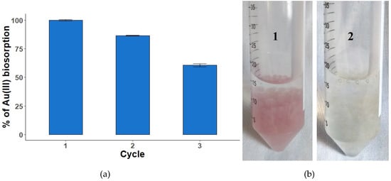 In order to identify the potential reusability of the encapsulated bacteria in alginate, the efficiency of gold capture was tested for three cycles. The results in Figure 5a show a decrease in the percentage of gold biosorption after the third cycle of reuse. Nevertheless, the efficiency continues to be higher (60%) than that observed for the free L. sphaericus CBAM5 cells (51%) in their first cycle. This reveals a clear advantage in the use of encapsulated cells for metal removal.