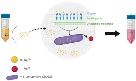 Previous studies demonstrate that certain types of bacteria possess heavy metal resistance and detoxification mechanisms, which may be extracellular or intracellular and specific to a certain metal or to a variety of them []. This type of bacteria can therefore proliferate in metal-contaminated environments and may be able to capture these metals [,]. As an example, Lysinibacillus sphaericus is a gram-positive bacterium isolated from a uranium mining waste pile [], which has a surface layer (S-layer) protein, a porous lattice that protects it and acts as an ion trap. Moreover, several studies have revealed L. sphaericus’ ability to accumulate heavy metals such as Pb(II), Cr(VI), Cd(II), among others [,,,] due to its S-layer protein and heavy metal efflux pumps [,]. It has also recently been found that L. sphaericus is able to accumulate and adsorb Au(III) and that there is evidence for the biosynthesis of gold nanoparticles or colloids [,].