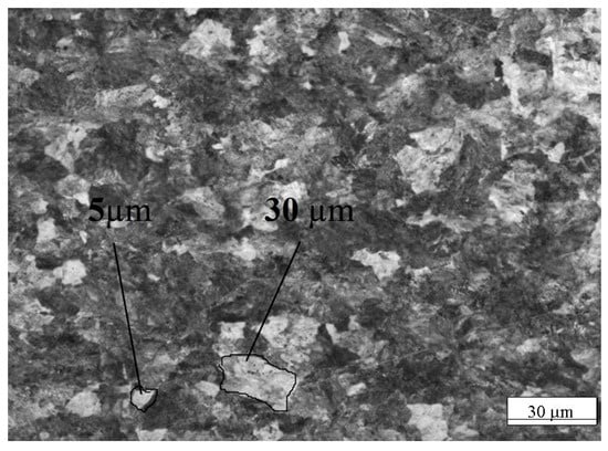 The wire was produced by drawing from a rod. After drawing, the wire was heat treated by patenting under the following regimes: furnace heating at the temperature of austenization 980–1000 °C for 60 s, isothermal cooling in melted lead at 560 °C for 20 s with further soaking in air to the ambient temperature. The pearlite structure with grain size of 5–30 µm was obtained. A typical wire microstructure after heat treatment is shown in Figure 1.