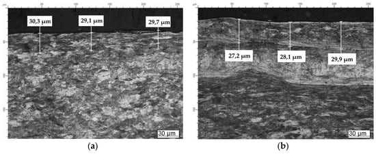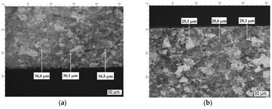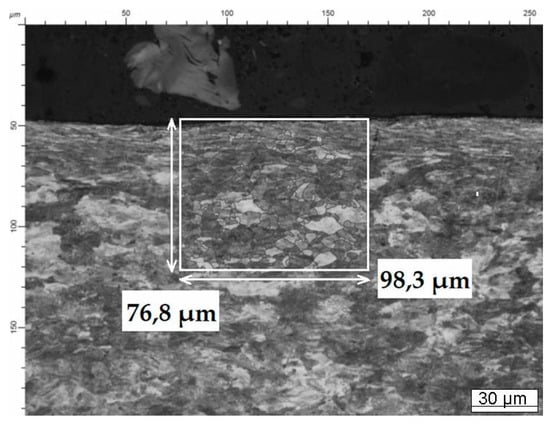 The special area was chosen on the obtained images for further microstructure analysis, so called the rectangle of analysis, with the average square of 7000–10,000 µm2 (Figure 4). Intervals with 5 µm in width from the surface to the center of the sample were used for the coefficient A estimation.