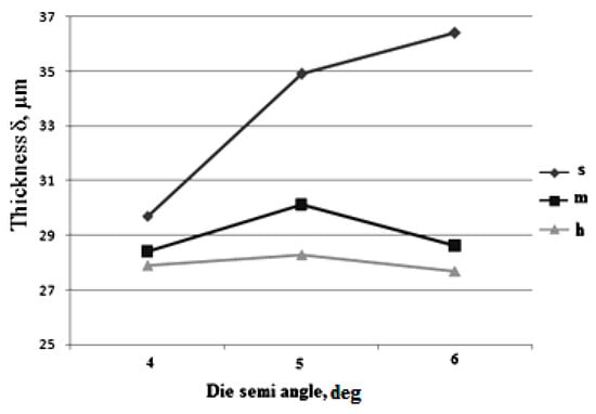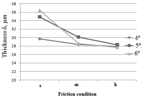 From the data in Table 3, Figure 9 and Figure 10 it is evident that at thin wire drawing the increase of die semi-angle from 4° to 6° at soft friction conditions leads to the increase of the depth of the layer of severe plastic deformations from 29.7 µm to 36.4 µm. Even so, for medium and hard friction conditions, the effect of the die semi-angle is not evident because in this case the depth of the layer changes no more than 1–2 µm. For soft friction conditions the interesting fact can be stated. With the increase of the die semi-angle, the length of contact surface between carbon steel wire and the die (tool) decreases. At the same time, despite the contact surface decrease, the thickness of the layer increases. It is an unexpected result. It was assumed earlier that at drawing, the increase of contact length between the wire and the die had to result in the intensive wear of the die and formation of the thicker layer. This result needs further theoretical justification.