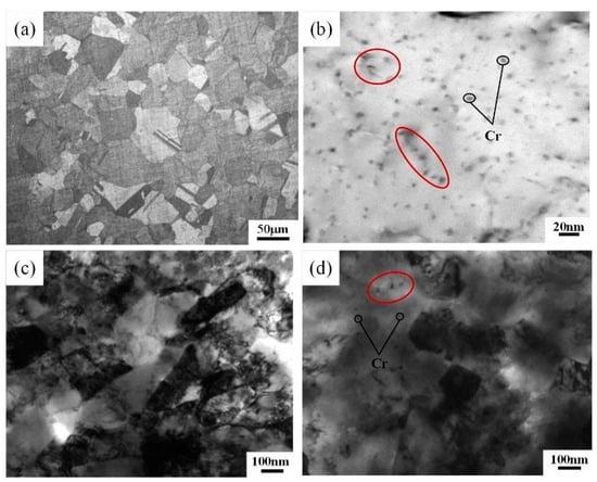 Figure 2 shows the OM and TEM micrographs of the CG and UFG Cu-Cr-Zr alloys, respectively. From Figure 2a, it can be seen that the grain boundaries of CG samples were very clear and took on near full equiaxial grain morphology with an average grain size of about 50 µm. There were very few dislocations within the grains, which was manifested by a completely recrystallized microstructure. The aging treatment led to the precipitation of high-density Cr particles with a diameter of 10 nm. Among them, a small part of Cr particles were concentrated within the grain (Figure 2b). ECAP processing caused significant grain refinement, and a large number of dislocations in the matrix can still be observed in Figure 2c. The average grain size of the UFG specimens were calculated as ~200 nm. After aging treatment, the dislocation density was remarkably reduced. In addition, the precipitation of Cr particles was less in comparison to CG alloys.