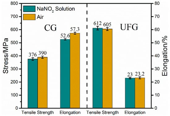 The average ultimate tensile strength (UTS) and elongation of CG and UFG alloys with NaNO2 solution and air.
