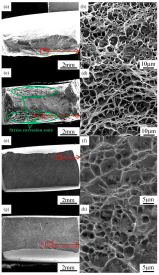 Figure 4 shows the fracture morphologies tested in air and NaNO2 solution, respectively. The CG samples showed an obvious dissolution, microvoids, and minor cracks in NaNO2 solution compared to in air, and a stress corrosion zone was clearly visible (Figure 4c). On the contrary, the fracture surface of the UFG specimen was essentially the same in air as in solution, and the surface was flat without large corrosion ditches (Figure 4e,g). Therefore, the stress of SCC in the CG sample was much lower than that of , while the UFG sample appeared to be immune to SCC until it was close to the relatively high stress of . The characteristics of CG and UFG specimens fracture surface failure in NaNO2 solution were similar to those observed by Yamasaki [14]. The stress corrosion of CG samples in NaNO2 solution was generally a transgranular fracture mode. For both types of specimens, fracture dimples were significantly different. The dimples of CG samples were large and the crack aggregation and diffusion ability was strong (Figure 4d), suggesting that when in solution it underwent enormous losses in ductility and strength, therefore indicating a very high SCC susceptibility compared to the UFG alloys. It also showed a transgranular dimple fracture. A typical dimpled structure can be observed in Figure 4f,h. When UFG samples were tested in air and in solution, fine and dense dimples were observed in the fracture. They were corroded uniformly when the aggressive ions attacked their surfaces. Intergranular SCC occurred in UFG Cu-Cr-Zr alloys, which was attributed to its high grain boundary volume fraction, and the grain boundary weakening due to chemical corrosion and stress corrosion along grain boundaries [16].