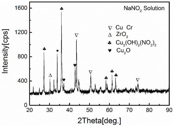 Figure 5 shows the X-ray diffraction patterns of the fracture surface. The XRD analysis indicated the presence of diffraction peaks of Cu2O and ZrO2 on the surface of the samples. At the same time, Cu2(OH)2(NO2)2 also appeared on the surface of the substrate. The formation of passivation film in NaNO2 solution on the surface of the investigated alloys may involve the following electrochemical steps [13]: