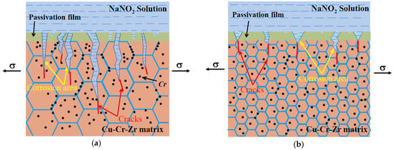 To clarify the effect of the two samples’ corrosion processes in the NaNO2 solution, the overall schematic illustration is shown in Figure 6. Generally, as the experiment progressed, the area around the sample suffered from localized corrosion, and the localized corrosion areas could further expand [16]. Figure 6a shows transgranular corrosion and transgranular SCC, and Figure 6b shows intergranular corrosion and intergranular SCC. For the CG samples, the severity of localized corrosion and the number of microvoids were greater than in the UFG samples tested in NaNO2 solution. The surface film of the CG samples was continuously destroyed, and severe stress corrosion occurred in the fracture (Figure 4c). An obviously preferential grain boundary degradation and selective corrosion of some grain interiors was observed in CG Cu-Cr-Zr alloys. At the same time, the uneven distribution of Cr particles and the increase of grain boundary defects made the chemical activity of the surface layer inconsistent, which prevented the growth of the passivation film at these active sites (Figure 6a). This caused the passivation film to grow irregularly, which contained more ion vacancies. The passivation film was also more susceptible to damage, and the passivation ability was weakened. On the contrary, the corrosion area of the UFG alloy was much smaller compared with that of the CG alloy, due to the increased volume fraction of grain boundaries. The SEM micrographs (Figure 4f,h) illustrate the intergranular SCC. Grain boundaries can act as a barrier to the development of corrosion [23]. The UFG alloys greatly hindered further corrosion of the solution due to the high grain boundary ratio. Finally, this caused the significant SCC difference between UFG and ordinary CG Cu-Cr-Zr alloys.