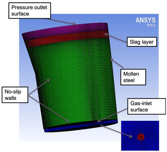 The computational domain and mesh system for the ladle configuration studied is shown in Figure 1. The number of cells was approximately 1 million. A mesh size of 8 mm was set throughout the domain, and a maximum mesh size of 4 mm was set for the inlet and slag layer. ANSYS Fluent software was used to perform the multi-phase flow simulations. At the inlet of the ladle, velocity inlet boundary condition, pressure outlet condition at the ladle top surface, and no-slip boundary condition was used at the ladle walls. The finite volume technique was used for the discretization of conservation equations and SIMPLE scheme was used for the pressure-velocity coupling. The volume of fluid (VOF) model was used to track the gas/steel/slag behavior and the species transport model was used to calculate the mixing time of the nickel alloy. The variable time step was used by setting the Courant number to 2 and the convergence criterion was set to 10−5 for the residuals of dependent variables.