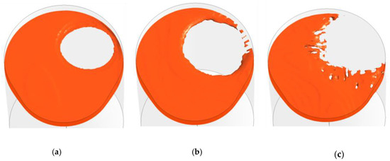 Open-eye size in the ladle from simulation results (Z = 3.37 m): (a) Q = 100 NL/min, (b) Q = 300 NL/min, and (c) Q = 500 NL/min.