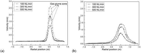 Velocity distribution profiles for different gas flow rates from the ladle bottom: (a) 1.5 m (b) 3.0 m.