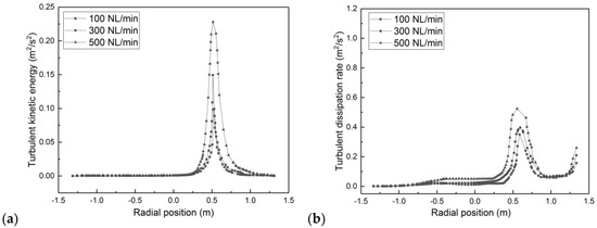 Figure 5, Figure 6 and Figure 7 depict the velocity, turbulent kinetic energy, and dissipation rate profiles on the horizontal plane that pass through the position of the plumes at heights 1.5 m and 3.0 m from the bath bottom. The flow velocity in the plume zones is very high and increases with increase in the gas flow rates, whereas small flow velocities are observed in the zone around the plumes. The flow velocities increase from 1.2 to 2.5 m/s at a height of 1.0 m above the bath bottom, and 0.5 to 1.4 m/s at a height of 3.0 m above the bath bottom when the gas flow rate is increased from 100 to 500 NL/min. The flow velocities tend to decrease as the flow reaches the top surface of the ladle bath. The same trend is followed for the turbulence kinetic energy and dissipation profiles, which can be seen in Figure 6 and Figure 7. The predicted velocity fields follow the same trends of radial velocities, which were, measured physically Xie et al. [31,32].