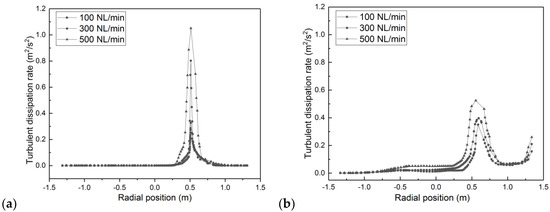 Turbulent dissipation rate profiles for different gas flow rates from the ladle bottom: (a) 1.5 m (b) 3.0 m.