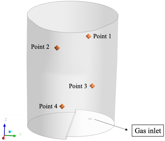 In this study, the mixing time is defined as the time to attain a 95% degree of homogenization in the molten steel. The locations of points to calculate the mixing time in the ladle are shown in Figure 8. In order to simulate the addition of nickel alloy, the tracer was released in the form of circle with radius of 0.196 m, located just above the center of the plug where the plume breaks the slag layer and creates the open-eye. The shell formation and subsequent melting of the alloy was neglected in the simulations.