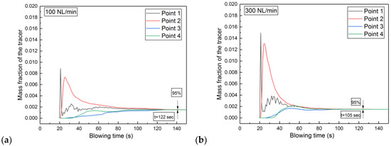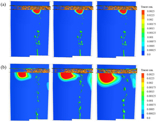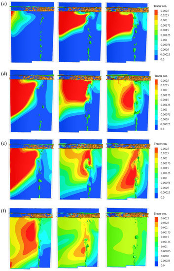 Figure 9 displays the concentration profiles of the tracer inside the ladle after an addition time of 0 s, 5 s, 10 s, 20 s, 40 s, or 60 s for different argon flow rates. At 0 s, the tracer is injected through the generated open-eye which is located at the top-right side of the ladle furnace (see Figure 9a). As seen in Figure 9b, the tracer started to dissolve into the molten steel at 5 s, but moved to the ladle surface due to the direction of the high gas flow coming through the nozzle located at the bottom of the ladle. The dissolution of tracer was higher at a gas flow rate of 500 NL/min, when compared to a low gas flow rate of 200 NL/min. The same trend of tracer distribution in the molten steel was followed at 10 s and 20 s (see Figure 9c,d). By 40 s, the tracer had spread out almost throughout the whole ladle at a gas flow rate of 500 NL/min, while for a gas flow rate of 100 NL/min, it was still dissolving, with approximately 65% dissolved. The tracer had almost spread out at 60 s for all gas flow rates as seen in Figure 9f, and the tracer was completely spread out when the ladle furnace was operated at a high gas flow rate of 500 NL/min.