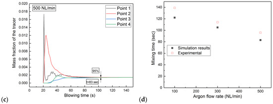 Figure 10a–c depict typical tracer response curves of four monitoring points and the procedure adopted to evaluate the 95% mixing time for different argon flow rates. The average mixing time value at Point 1 from industrial measurements and numerical simulations are shown in Figure 10d. During the experiments, steel samples of concentration were taken from the ladle at certain intervals of time and at a certain location. The nickel alloying to steel was done at sampling point 0 to reach case-specific nickel aim-content. Steel samples were then used to evaluate the required mixing time for obtaining aim-nickel content, starting from point of alloying. It can be seen that with an increase in the argon gas flow rate, the mixing time decreased, and the same trend was followed in both experiments and simulations. The present results of mixing times in the industrial scale ladle are in good agreement with the simulation results of Liu et al. [26]. The numerical simulation values for mixing time agree fairly well with the industrial measurements, with a maximum error of 16.3%. The possible source for the error between the experiments and simulations is the tracer addition method and neglecting of shell formation and subsequent melting of the alloy in the simulations.