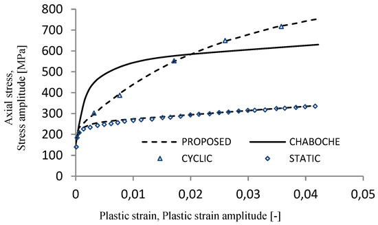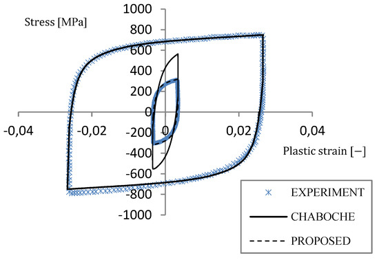 The experimental cyclic stress–strain curve data considered without linear isotropic hardening (published in [15]) and the predicted data corresponding to the proposed model are also shown in Figure 3. The cyclic stress–strain curve of the classic Chaboche model, calibrated using the large hysteresis loop (, is also presented in Figure 3. It is again clear that a more robust model is needed.