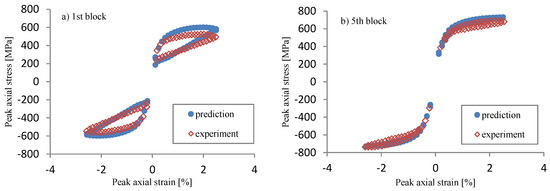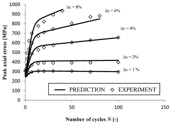 Figure 8 presents a comparison with an experiment, in which the peaks of the hysteresis loops are plotted for the first and fifth loading block. The relative error of the prediction was about in the first block (for amplitude of strain ), but it was reduced to in the fifth loading block.