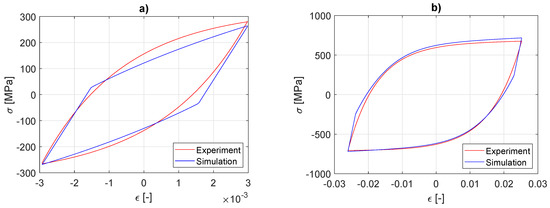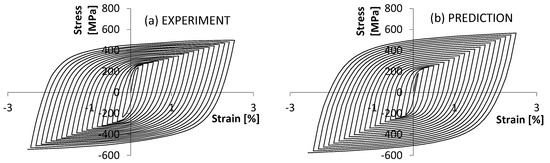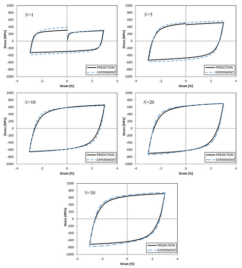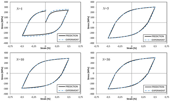The results of the prediction of the transition behavior of the SS304 steel material during uniaxial cyclic loading (Figure 4) were supplemented by hysteresis loops for strain amplitudes of and , respectively (Figure 5 and Figure 6). These results can be compared with the experimentally-obtained hysteresis loops published in [15].