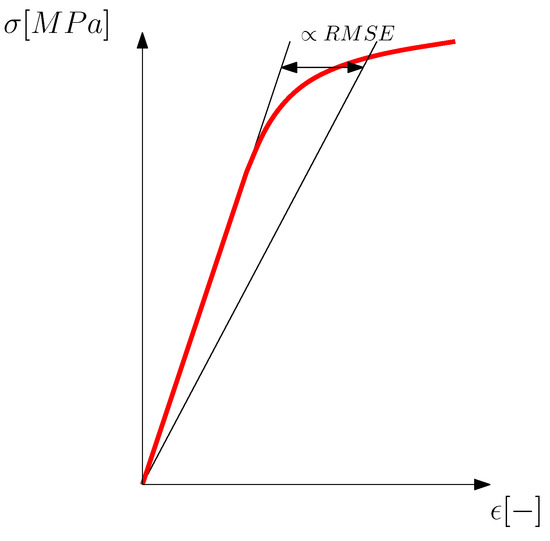 can be interpreted as the point where the linear part of the tensile curve turns into the non-linear part (see Figure 10). The root mean squared error method () can be applied to find the point. In the tensile test (or in the first cycle of the cyclic test), the yield strength corresponded to . Applying to each SHL, the actual yield stress Y was found. This shows the development of the actual yield stress Y during the fatigue life; see Figure 11.