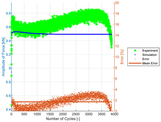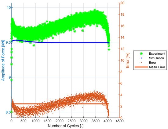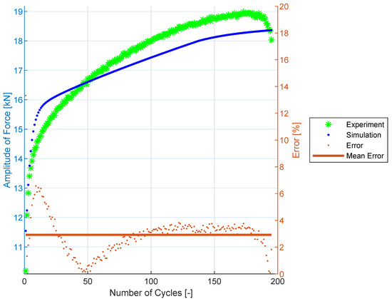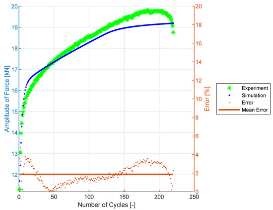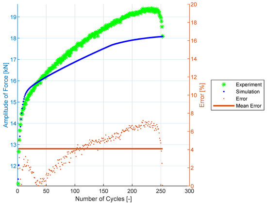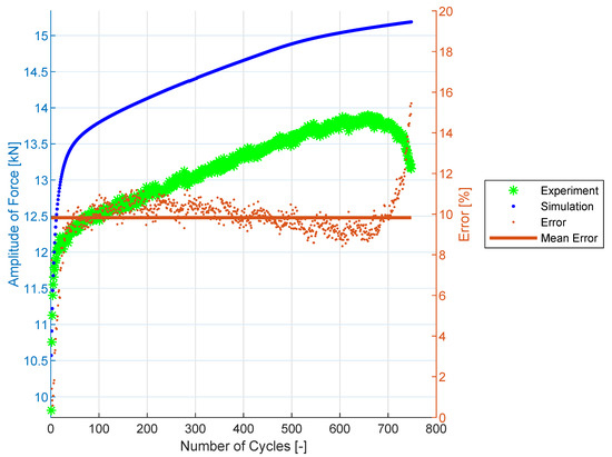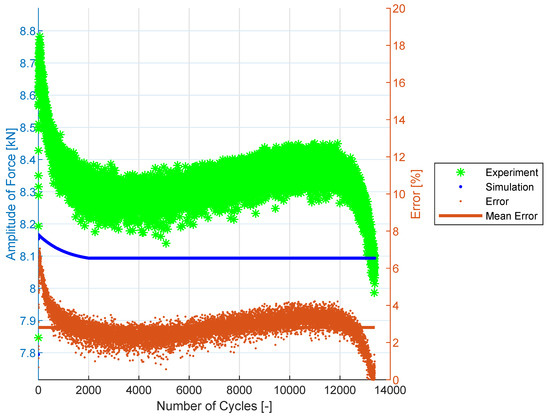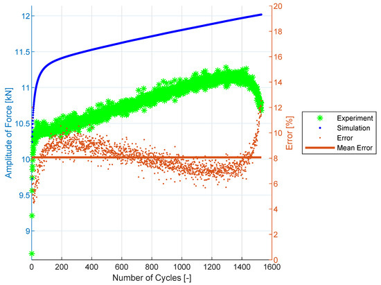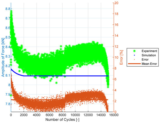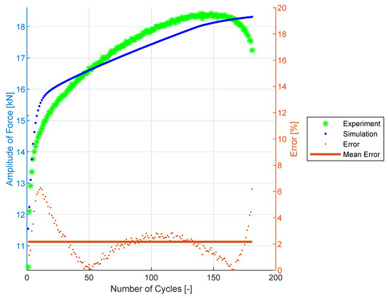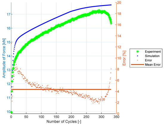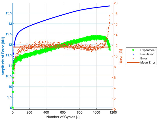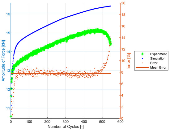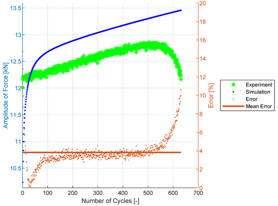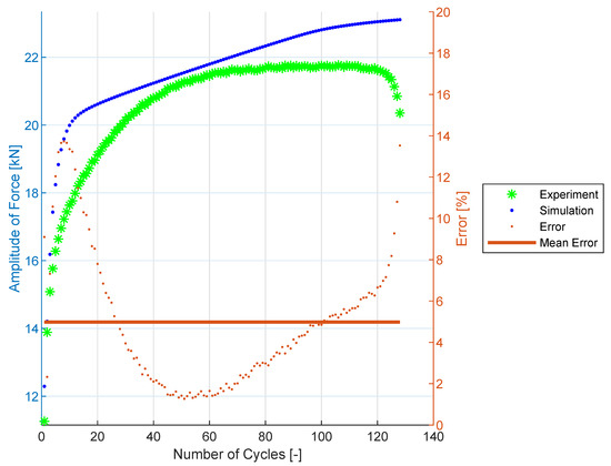 The material model did not include a simulation of the material damage process, so only experimental data up to damage were used for the calibration. The number of cycles used was , and this number corresponded to the drop in the loading force during the experiment by 2%, due to crack initiation and propagation, leading to failure.