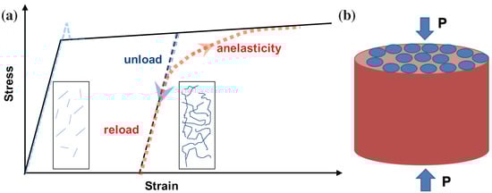 In uniaxial compression of microscopic crystals, discontinuous plastic yielding may be realized by considering a collection of randomly placed dislocation sources (pinned dislocation segments) in an otherwise dislocation-free crystal (see Figure 1). However, even in such an idealistic case, after loading to a finite strain, the unloading process to zero stress will leave a corresponding plastic strain and dislocation structure. Reloading to the flow stress appears quasi-continuous, but the behavior is typically nonlinear and “anelastic” [18,19,20,21,22,23,24], originating in locally irreversible but small deformations that correspond to abrupt jumps of pre-existing dislocations. Experimentally in small volumes, it has been found that uniaxial compression of crystalline nanopillars ranging from ∼100 nm to ∼10 m is characterized by the absence of mobile dislocation segments (“exhaustion” mechanisms), leading to abrupt events and jerky loading responses [7,25,26,27,28].