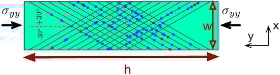 The uniaxial compression of a nano/micro-pillar is carried out by two-dimensional (2D) discrete dislocation dynamics, where only edge dislocations are considered in one or multiple slip systems. This is an accurate model for thin films [11,12] and it can be considered as a phenomenologically consistent model for uniaxial nanopillar compression [7,35]. The schematic of the uniaxial compression is shown in Figure 2. Using small strain assumptions, plastic deformation is described through the framework developed in [36], where the material’s state determination employs strain/stress superposition. Thus, shape asymmetries related to plastic deformation are effectively not considered. Each edge dislocation is treated as a singularity in an infinite space with Young modulus E and Poisson ratio . The application of the dislocation analytical solution, which is valid in an infinite space, needs a smooth image field to ensure that actual boundary conditions are satisfied. Hence, the displacements , strains , and stresses are written as