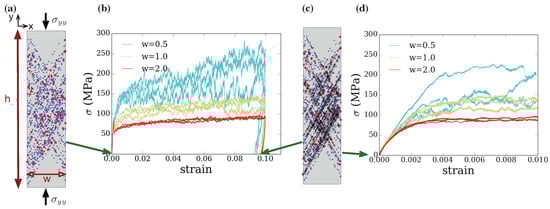 Slip planes are spaced at 10b, where b is the Burgers vector magnitude of 0.25 nm. We do not consider slip planes that cross the loading boundaries (see Figure 2) to avoid numerical difficulties induced by dislocations hitting the boundaries. Such assumptions will not alter the plasticity mechanism observed in the sample since the effective slip area is 85% of the sample geometry. The crystal is initially stress and mobile-dislocation free. This stands for a well-annealed sample, yet with pinned dislocation segments left that can act either as dislocation sources or as obstacles. A dislocation source mimics the Frank–Read source in two dimensions [36]. Point obstacles are included to account for the effect of blocked slip caused by precipitates and forest dislocations on out-of-plane slip systems that are not explicitly described. Stress caused by the obstacles is not considered in the model. The strength of the obstacles is taken to be 150 MPa with 20% standard deviation. Obstacles are randomly distributed over the slip planes with a density that is eight times the source density [35], and a dislocation stays pinned until its Peach–Koehler force exceeds the obstacle-dependent value .