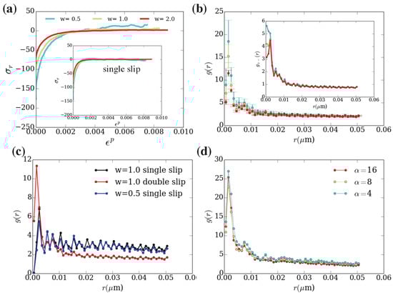 Single-Slip vs. Multi-Slip Loading Conditions and Structural Correlations. (a) Reconstructed stress–strain curves for different w with where is the flow stress prior to unloading. The inset is the reconstructed stress–strain curves when single slip system is used in the modeling. (b) Pair correlation of dislocation structure obtained by unloading. The inset shows correlation. The color of each curve corresponds to w show in panel (a). (c) Pair correlation of dislocation structure in double and single slip systems. (d) Pair correlation of dislocation structure in samples of different aspect ratio and fixed .