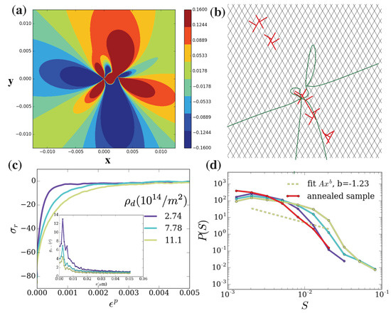 Naturally, the formation of the identified dipoles and the associated patterns should become more probable as the dislocation density increases for the same system size (or as the sample size increases for the same dislocation density). For this purpose, we investigate the effect of different dislocation densities (for w = 2 ) through creating dislocation ensembles by unloading at different strains (1%, 5% and 10%). We consider dislocation densities () that are 2.74, 7.78, 11.1 (see Figure 6c). It is seen that larger initial dislocation density leads to a more pronounced nonlinearity. The is shown in the inset, which signifies that the smaller dislocation density has a higher peak. Our model is benchmarked with experimental data [35], i.e., and it predicts a realistic strengthening size effect and dislocation avalanche statistics in FCC crystals even though at a much higher strain rate than experiments. Assuming a sole dislocation density effect on the strength, we may estimate that the pre-existing dislocation density of the samples in Ref. [16,17] to be /m.