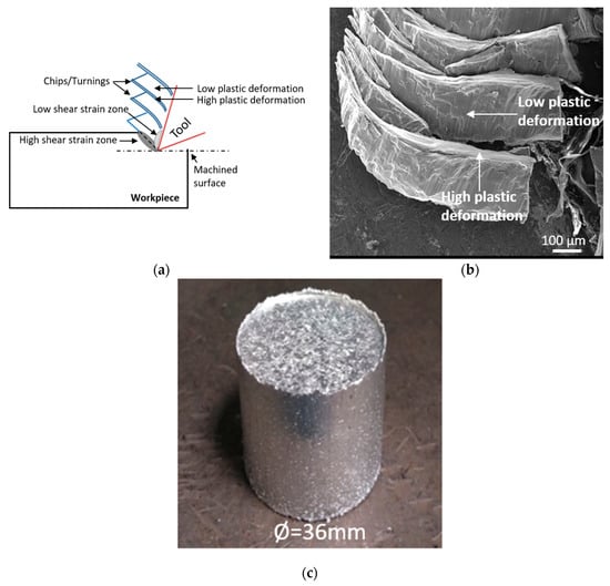 (a) Chip formation during turning; (b) chips/turnings (Depth of cut DOC of 1.5 mm) with apparent plastic deformation zones; (c) turnings compacted into a billet.