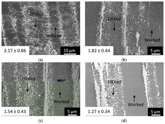 The microstructures (along the longitudinal section) revealed very fine recrystallized grains for all of the materials (Figure 3a–d), particularly the ones with prior induced deformation (turning). However, all materials exhibited a bimodal grain structure i.e., bands of dynamically recrystallized (DRXed) and elongated worked grains. Figure 3 indicates that with an increase in deformation in the material during turning (DOC), the average DRXed grain size decreased progressively. AZ91_1.5DOC exhibited the lowest DRXed grain size (1.27 µm), which was 60% lower than that of the AZ91_AR.