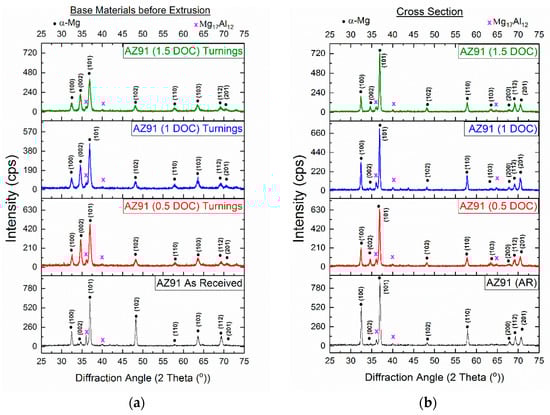The individual chips shown in Figure 2b were subjected to XRD to identify the presence of phases prior to compaction and extrusion. The results in Figure 4a show that the materials comprised of α-Mg and Mg17Al12 phases in the as-received condition as well as in the 0.5, 1, and 1.5 DOC turnings/chips. Compared to the as-received material in the ingot condition, the normalized intensity of Mg17Al12 peaks in the turnings was much lower, particularly at an angle of ~36°. This is believed to be due to the reduction in the size of the phases, thereby changing their distribution due to the processing that led to the drop in the intensity from the corresponding phase when subjected to x-ray diffraction. Furthermore, the XRD of AZ91 in the as-received condition revealed the lowest intensity at 34° (corresponding to the (0001) basal plane), indicating a strong basal texture. However, it is to be noted that the turnings did not exhibit any dominant texture as seen from their intensities due to the random selection of differently oriented turnings for XRD. Figure 4b also provides a qualitative idea about the texture of the materials. All the materials exhibited a strong texture with the intensity at 2 Theta of 34° corresponding to the basal plane, being the lowest in the XRD of the cross section of the samples. Although there could be a variation in the texture strengths, it was noted that all the materials exhibited a strong extrusion texture.