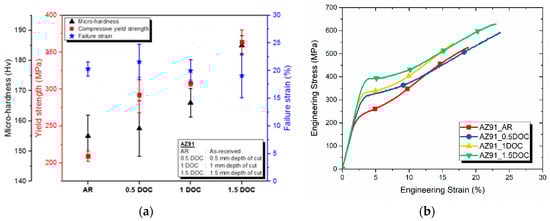 The micro-hardness and compressive properties are given in Figure 5a. A general observation was made that the micro-hardness of those materials with induced deformation was higher than that of the material that was not imparted with any prior deformation. Furthermore, with increase in the deformation (i.e., increased DOC), the micro-hardness increased significantly to as high as 185 HV in AZ91_1.5DOC. The compressive yield strength followed a similar trend as that of micro-hardness, i.e., the compressive yield strength progressively increased with increments in DOC as seen in Figure 5b. AZ91_1.5DOC exhibited the highest compressive yield strength of about 364 MPa, which was 75% higher than that of AZ91_AR. This shows the significance of this method in imparting strength to the material. Furthermore, the strains to failure were in the same range as that of the as received condition, with all the materials exhibiting a reasonable failure strain of >15%, indicating no compromise in the ductility of the materials under compressive loading.