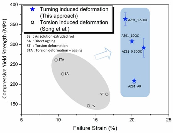 The remarkable increment in the compressive yield strength in the DOC materials as against the as received (AZ91_AR) was due to a few critical factors. One such factor is the development of fine-recrystallized grained structures in DOC materials compared to AR, which helps in improving the yield strength following the Hall–Petch equation [,]. This was substantiated by AZ91_1.5DOC exhibiting a grain size 60% smaller than that of the AR alloy and a yield strength 75% higher than the AR alloy. Furthermore, the prior deformation in the turnings resulted in strain hardened materials when compared to the as received material. Strain hardening, therefore, is another dominating strengthening mechanism that was responsible for AZ91_1.5DOC exhibiting a high compressive yield strength. Thus, this significant enhancement in the mechanical properties of the materials can be attributed to their grain structure, which is also correlated to the extent of prior deformation during turning (in the form of increasing DOCs). Another possible mechanism is the dispersion strengthening of magnesium by the oxides [] stemming from the surface of the chips. However, this needs further study and understanding before conclusive remarks can be made as to whether the size of the oxides plays a crucial role in the strengthening mechanism. Furthermore, the oxide size also affects the ductility. Hence, it is the future scope of this work to identify the isolated contribution of such a mechanism.