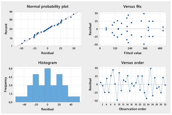 Figure 2 shows the residual analysis for the particle size response, which is characterized as an important procedure to ensure that the mathematical models developed consistently represent the responses of interest. A normal probability graph is only a graph of the cumulative distribution of residual on normal probability plot, which is the graph with the ordinates staggered so that cumulative normal distribution is potted as a straight line []. In addition, the normal probability plots of the residuals must be distributed normally and independent of each other. The points in the normal probability plots of the residuals reveal a straight line confirming the reasonableness of the model. Normality test plot and histogram indicated normal distribution of residuals. On the other hand, the residual graphs standardized by intensity of the responses and by order of the experiments all indicate a random dispersion of the residuals (as can be seen in Figure 2).