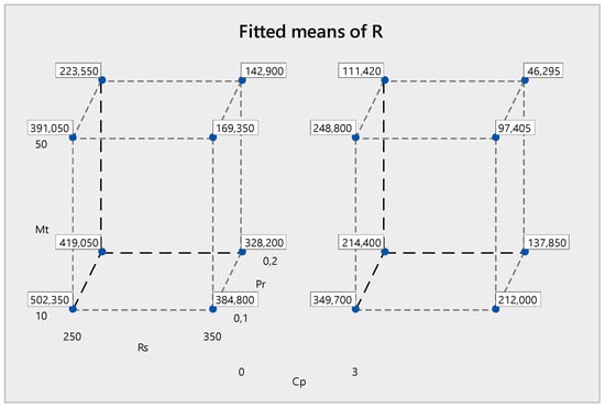 The mathematical model for factorial planning 24 is given by Equation (1), where R is the average size of the particle and Rs, Mt, Pr, Cp mean rotation speed, milling time, powder to ball weight ratio and carbide percentage, respectively. For the following mathematical model, all the coefficients were estimated in its coded format, as from the experimental results and using the Ordinary Least Square method (OLS), this latter present in the statistical software Minitab.