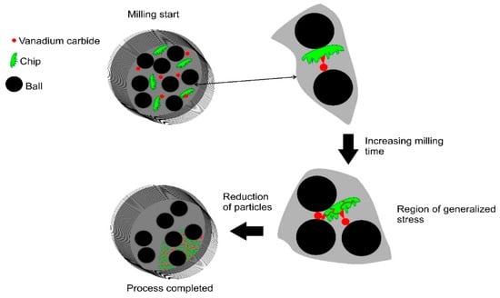 Studies have been carried out to produce composites of a sintered metal matrix with the addition of ceramic particles, called oxides or carbides, such as vanadium carbide (VC), niobium carbide (NbC), titanium carbide (TiC) and tungsten carbide (WC). These particles have attracted interest due to their exceptional mechanical, physical and chemical properties, aiming to increase the high energy milling efficiency and the mechanical strength of the material [,]. Vanadium carbide is an important material for industrial applications due to excellent resistance to high temperatures, and its high chemical and thermal stability, even at high temperature []. In some studies, it was verified that the addition of carbide in the process of the high energy milling of chips from the machining process, resulted in greater efficiency of the milling process, with a greater decrease in the size of the particles, obtaining sizes of nanometric particles [,,].