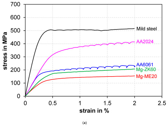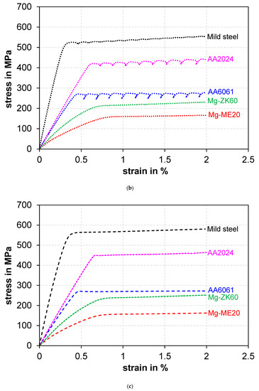 To confirm the presence of serrations, we have tested magnesium and steel specimens under the same test conditions for aluminum alloys. However, no serrations were observed in both magnesium (ZK60 and ME20) and mild steel specimens under the present three combinations of auto-tuning, as seen from Figure 2a–c. The yield stress of AA6061 and AA2024 alloy was obtained to be higher than that of the magnesium alloys and lower than that of the steel. This suggests that the serrations are not related to the strength level rather a property of specific materials.