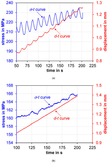 Typical curves of stress and displacement with respect to time of AA6061 and Mg-ME20 alloys after load and position auto-tuning is plotted in Figure 3a,b, respectively. It is obvious that the displacement–time (d–t) curve of AA6061 is step-like and the stress–time (σ–t) curve represents the corresponding oscillations in Figure 3a. Similar behavior was reported by Qian et al. [10] in a twinning-induced plasticity steel at different strain rates. Apparently, the onset of serrations coincides with an abrupt change of the crosshead displacement. The localized high strain in the bands inside of the gage length is the characteristics for the nucleation of serrations [7,32]. In the case of AA6061 alloy, the abrupt increase in the stress coincides with an increase in the crosshead displacement, while the halt (or slight decrease) in the displacement corresponds to a decrease in the stress (Figure 3a). In contrast, Figure 3b represents a smooth and linearly increasing curve of displacement vs. time, confirming the smooth flow curve free of oscillations in the ME20 magnesium alloy in Figure 2b, although the stress vs. time curve exhibits some extent of noise but it looks pretty much linear without the nearly periodic oscillations in the AA6061 aluminum alloy in Figure 3a. The different trends in Figure 3a,b would further confirm that the stress drops/serrations are related to specific material characteristics rather than the machine noise.