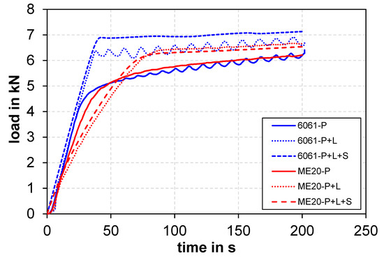 Load vs. time curves of AA6061 and ME20 alloys obtained after various combinations of auto-tuning.