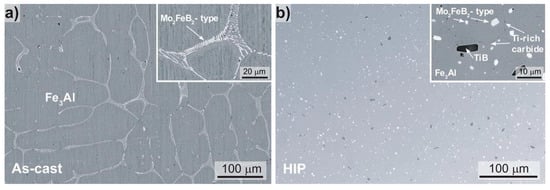 3.1. Material Characterization of as-Cast and HIPped Fe-Al-Mo-Ti-B